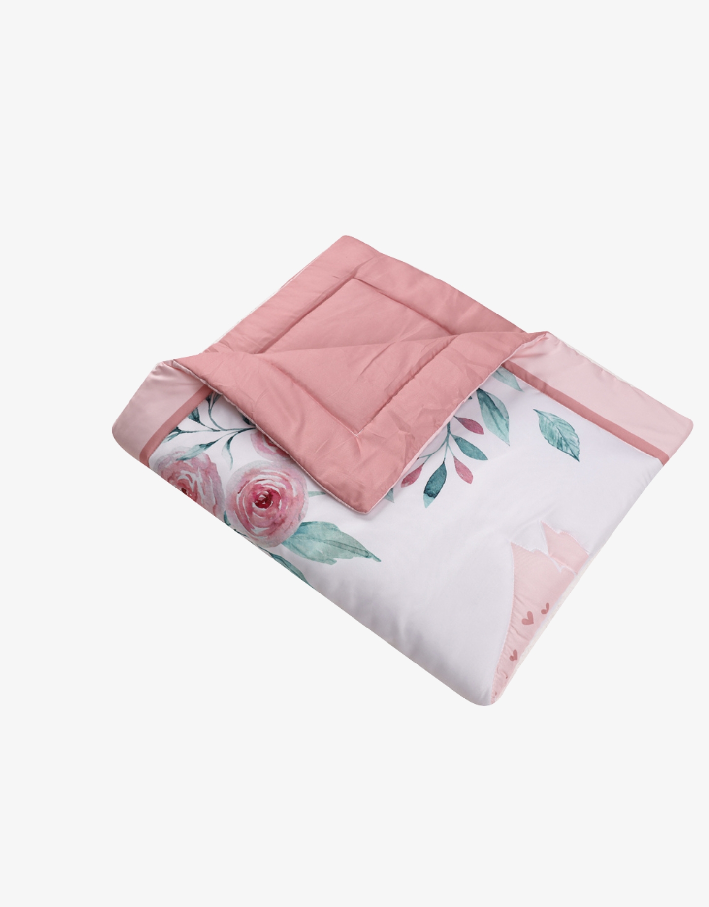 Wrap your baby in comfort with the coordinating bolster pillow adorned with charming pink heart rain, while the rectangular pillowcase continues the enchantment with whimsical floral illustrations. Safety is thoughtfully considered with the padded bumper set, providing gentle protection as your baby explores their crib.